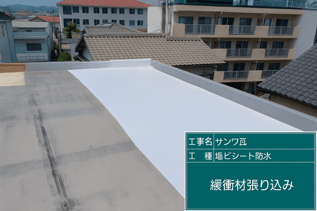 緩衝材張り込み: 最初に、下地をきれいに掃除し、その上に緩衝材を隙間なく貼り付けます。これは、建物の動きを吸収し、防水層への負担を減らすために非常に重要な工程です。